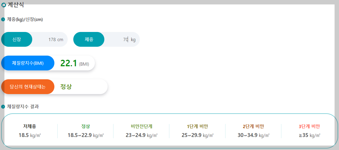 | 정상 | 18.5 ~ 24.9 | 18.5 ~ 22.9 | 18.5 ~ 23.9 |
