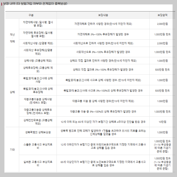 이 보험은 개인이 가입한 다른 보험과 관계없이 보상이 중복으로 지급됩니다.
