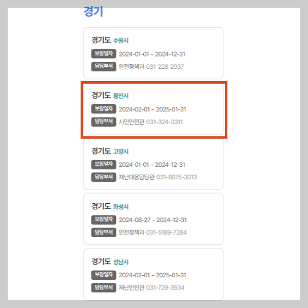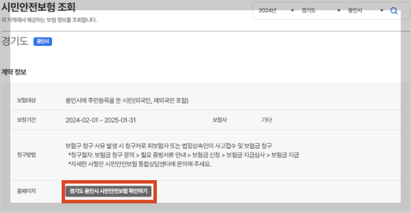 경기도 기준 [계약 정보] >> [경기도 용인시 시민안전보험 확인하기]를 클릭합니다.