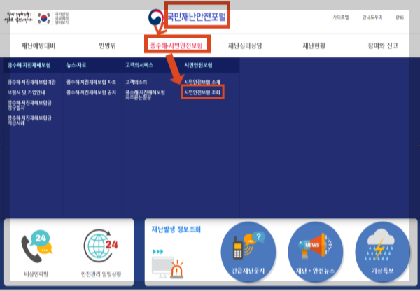 [풍수해, 시민안전보험 >> 시민안전보험 조회] 순으로 클릭합니다.