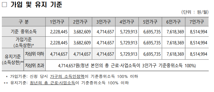 - 가입 기준 : 신청 당시 가구의 소득인정액이 기준 중위 소득 100%이하
