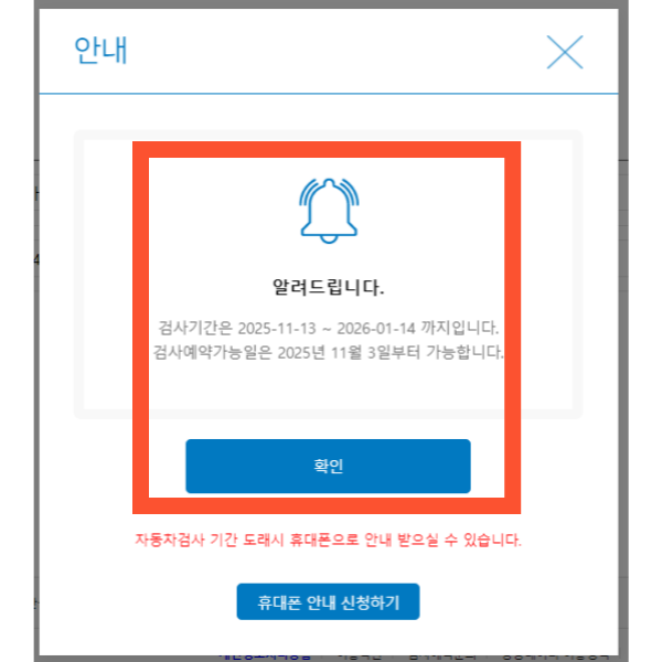 5) 팝업창으로 알림창이 뜨며, 검사예약 가능일을 알려줍니다.